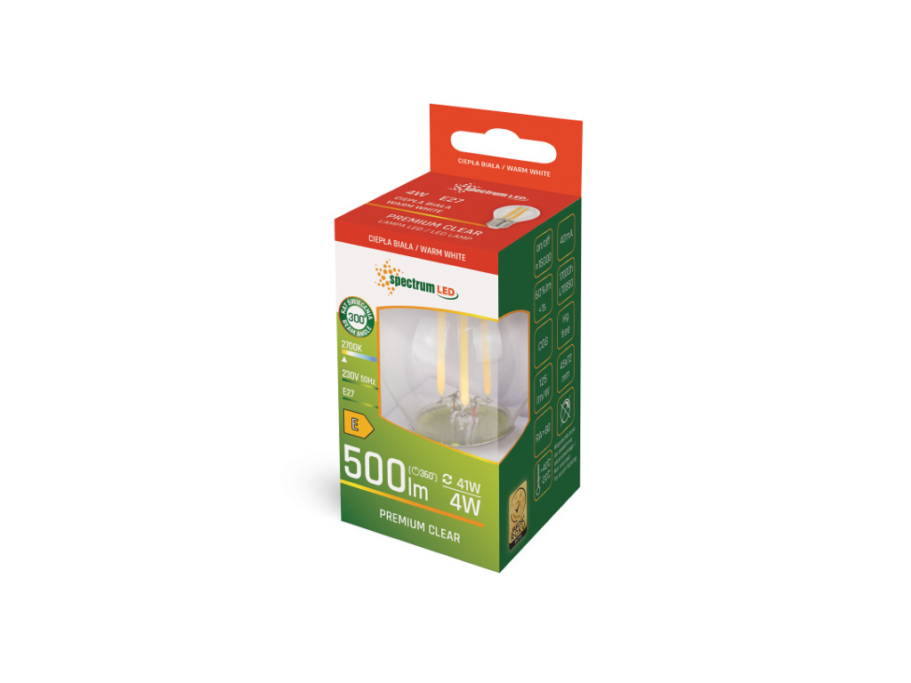 Retro LED žiarovka so závitom E-27, výkonom 4W a tvarom G45 sa vyznačuje vysokou svetelnou účinnosťou 125 lm/W a vďaka použitiu odolných COG vlákien aj zvýšenou energetickou efektívnosťou. Žiarovka má široký vyžarovací uhol 300°, čo zaisťuje rovnomerné osvetlenie.