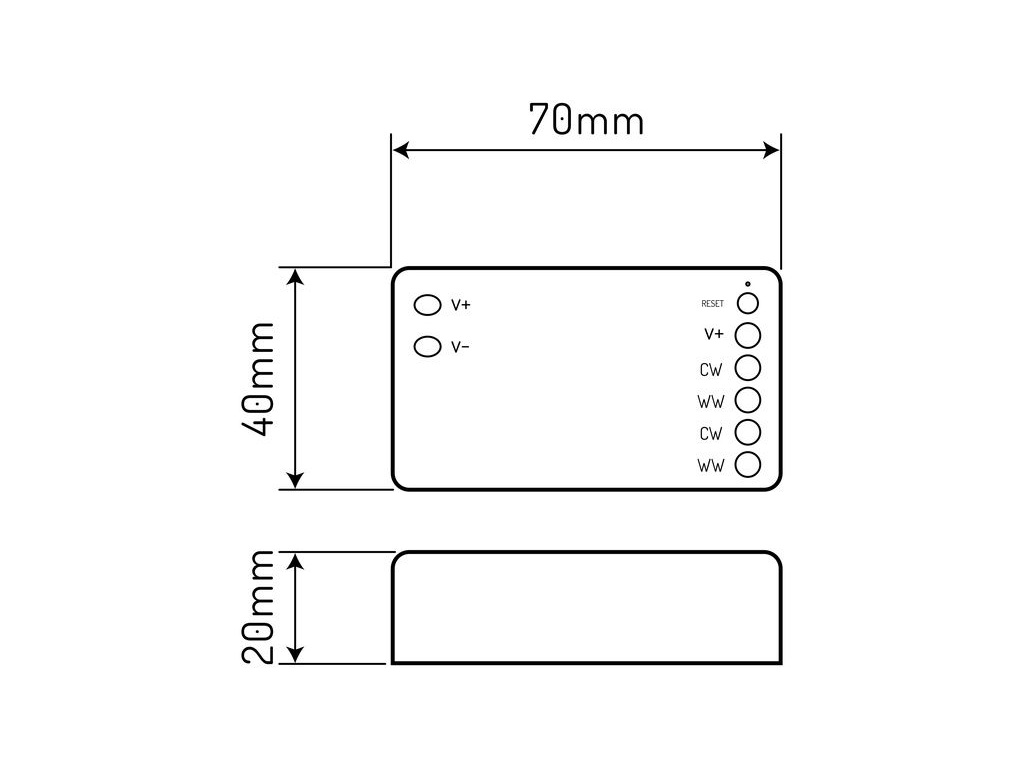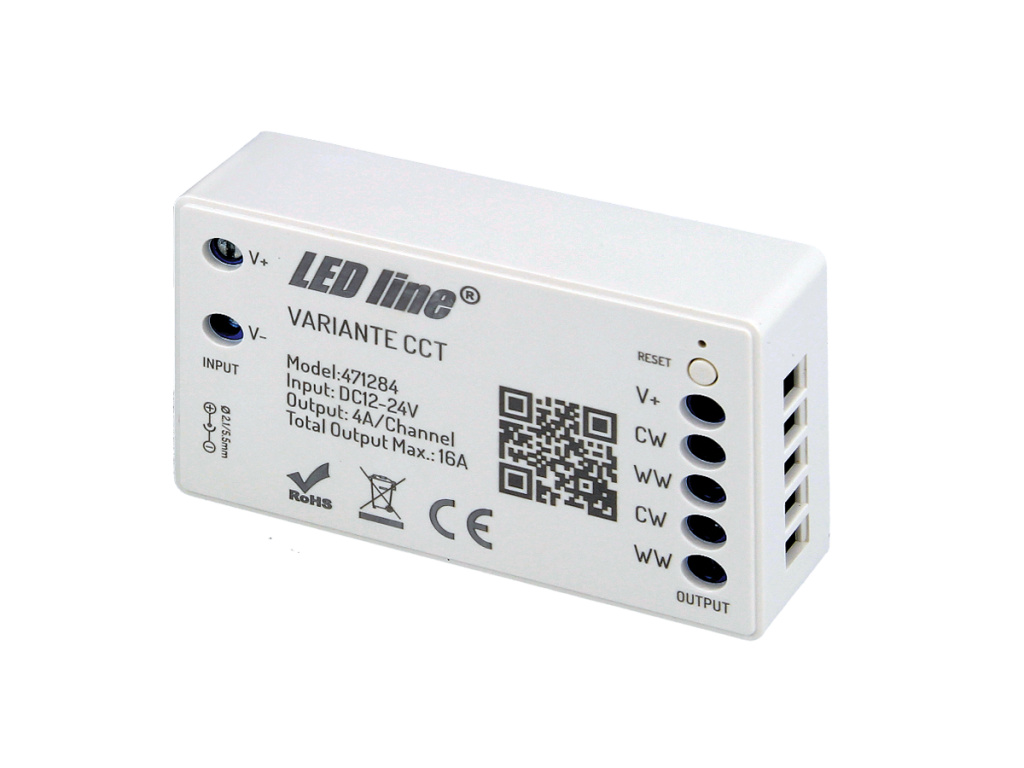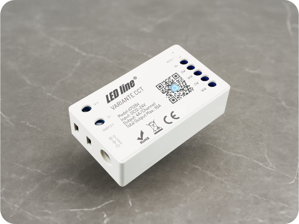 Tento prijímač je určený na ovládanie CCT LED pásov (s nastaviteľnou teplotou bielej farby). Umožňuje plynulé prepínanie medzi teplou a studenou bielou, stmievanie a prispôsobenie svetelnej atmosféry podľa potreby. Prijímač sa používa v kombinácii s kompatibilným diaľkovým ovládačom VARIANTE (nie je súčasťou balenia).